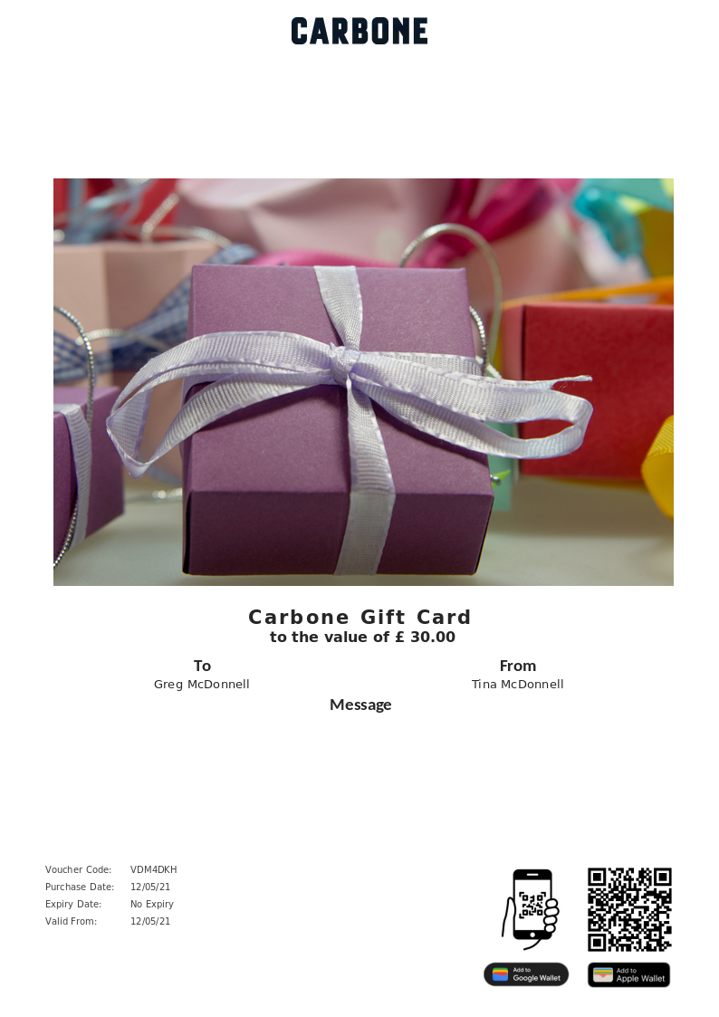 Carbone London allows you to purchase instantly printable gift vouchers, special offers and tickets using the Voucher Connect platform.